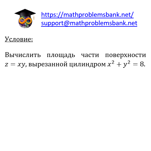 условие: Вычислить площадь части поверхности \( z=x y \), вырезанной цилиндром \( x^{2}+y^{2}=8 \).