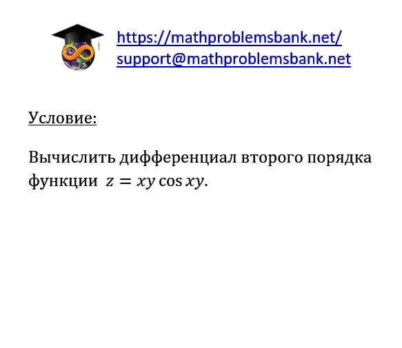 условие: Вычислить дифференциал второго порядка функции \( z=x y \cos x y \).