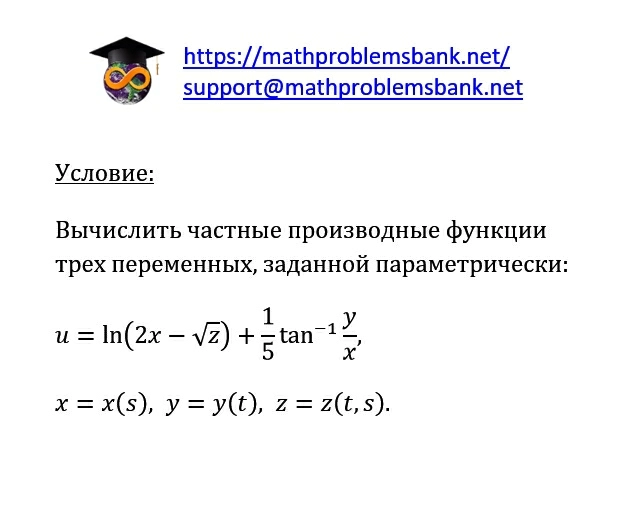 Условие: Вычислить частные производные функции трех переменных, заданной параметрически: \[ \begin{array}{l} u=\ln (2 x-\sqrt{z})+\frac{1}{5} \tan ^{-1} \frac{y}{x}, \\ x=x(s), \quad y=y(t), \quad z=z(t, s) . \end{array} \]