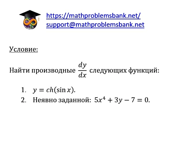 условие: Найти производные \( \frac{d y}{d x} \) следующих функций: 1. \( y=\operatorname{ch}(\sin x) \). 2. Неявно заданной: \( 5 x^{4}+3 y-7=0 \).