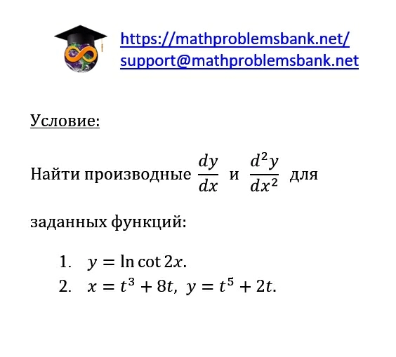 условие: Найти производные \( \frac{d y}{d x} \) и \( \frac{d^{2} y}{d x^{2}} \) для заданных функций: 1. \( y=\ln \cot 2 x \). 2. \( x=t^{3}+8 t, y=t^{5}+2 t \).