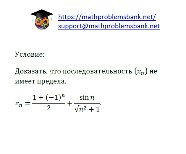 Условие: Доказать, что последовательность \( \left\{x_{n}\right\} \) не имеет предела. \[ x_{n}=\frac{1+(-1)^{n}}{2}+\frac{\sin n}{\sqrt{n^{2}+1}} . \]