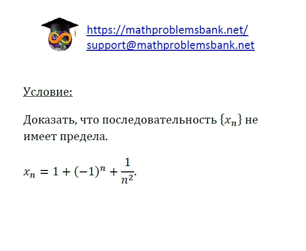 Условие: Доказать, что последовательность \( \left\{x_{n}\right\} \) не имеет предела. \[ x_{n}=1+(-1)^{n}+\frac{1}{n^{2}} \]