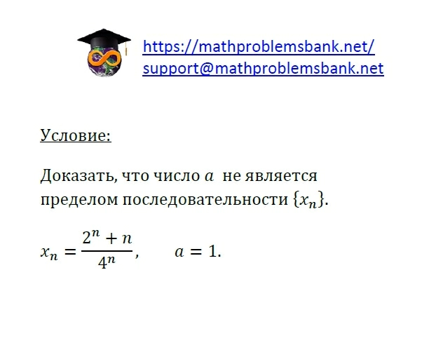 Условие: Доказать, что число \( a \) не является пределом последовательности \( \left\{x_{n}\right\} \). \[ x_{n}=\frac{2^{n}+n}{4^{n}}, \quad a=1 . \]