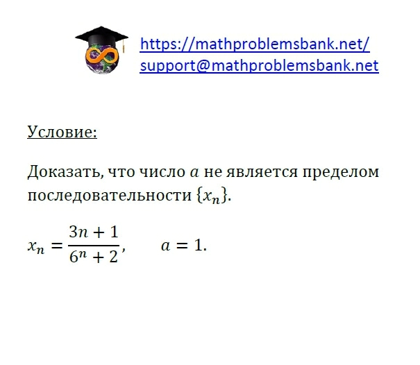 Условие: Доказать, что число \( a \) не является пределом последовательности \( \left\{x_{n}\right\} \). \[ x_{n}=\frac{3 n+1}{6^{n}+2}, \quad a=1 . \]