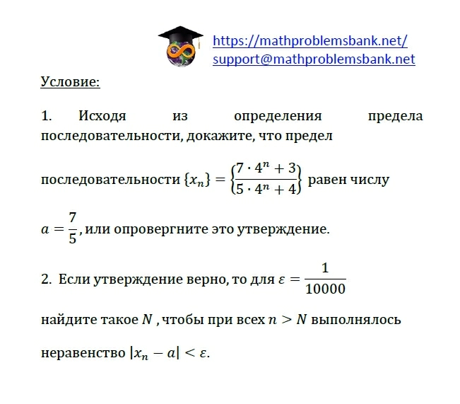 Условие: 1. Исходя из определения предела последовательности, докажите, что предел последовательности \( \left\{x_{n}\right\}=\left\{\frac{7 \cdot 4^{n}+3}{5 \cdot 4^{n}+4}\right\} \) равен числу \( a=\frac{7}{5} \), или опровергните это утверждение. 2. Если утверждение верно, то для \( \varepsilon=\frac{1}{10000} \) найдите такое \( N \), чтобы при всех \( n>N \) выполнялось неравенство \( \left|x_{n}-a\right|<\varepsilon \).