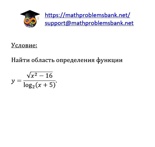 \( \underline{\mathrm{y}_{\text {словие: }}} \) Найти область определения функции \[ y=\frac{\sqrt{x^{2}-16}}{\log _{2}(x+5)} \text {. } \]