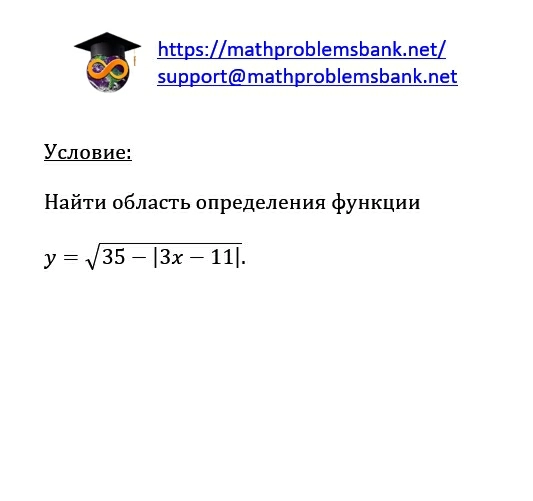 Условие: Найти область определения функции \[ y=\sqrt{35-|3 x-11|} \]