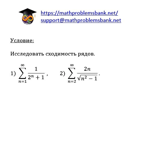 Условие: Исследовать сходимость рядов. 1) \( \sum_{n=1}^{\infty} \frac{1}{2^{n}+1} \), 2) \( \sum_{n=2}^{\infty} \frac{2 n}{\sqrt{n^{2}-1}} \).