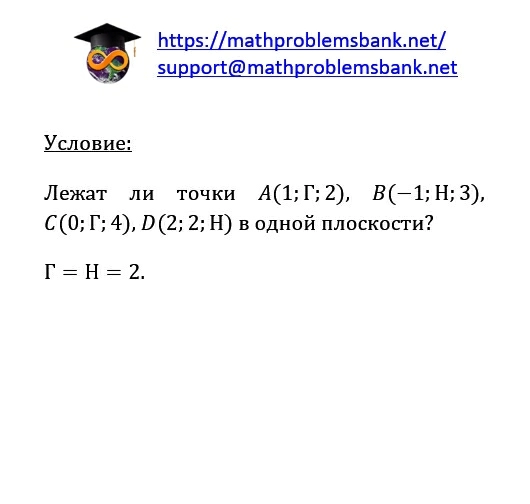 Условие: Лежат ли точки \( A(1 ; \Gamma ; 2), B(-1 ; \mathrm{H} ; 3) \), \( C(0 ; \Gamma ; 4), D(2 ; 2 ; \mathrm{H}) \) в одной плоскости? \[ \Gamma=\mathrm{H}=2 \]