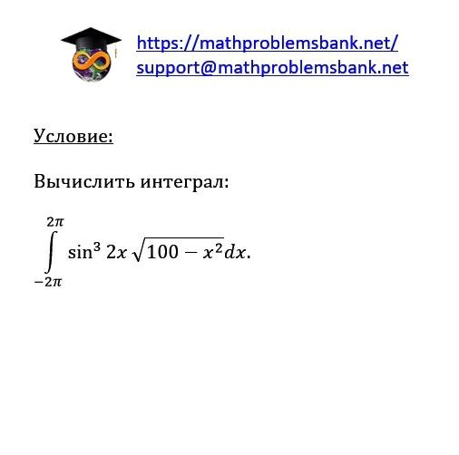 условие: Вычислить интеграл: \[ \int_{-2 \pi}^{2 \pi} \sin ^{3} 2 x \sqrt{100-x^{2}} d x . \]