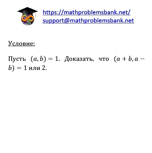 Условие: Пусть \( (a, b)=1 \). Доказать, что \( (a+b, a- \) \( b)=1 \) или 2 .