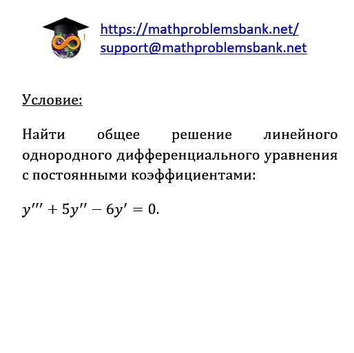 условие: Найти общее решение линейного однородного дифференциального уравнения с постоянными коэффициентами: \[ y^{\prime \prime \prime}+5 y^{\prime \prime}-6 y^{\prime}=0 \]