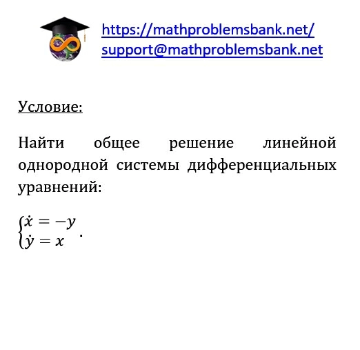 Условие: Найти общее решение линейной однородной системы дифференциальных уравнений: \[ \left\{\begin{array}{l} \dot{x}=-y \\ \dot{y}=x \end{array} .\right. \]