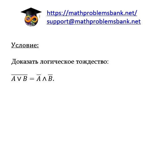 Условие: Доказать логическое тождество: \[ \overline{A \vee B}=\bar{A} \wedge \bar{B} \]
