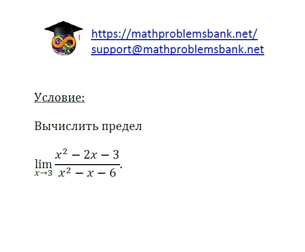 Условие: Вычислить предел \[ \lim _{x \rightarrow 3} \frac{x^{2}-2 x-3}{x^{2}-x-6} \]