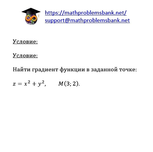 Условие: Условие: Найти градиент функции в заданной точке: \[ z=x^{2}+y^{2}, \quad M(3 ; 2) . \]