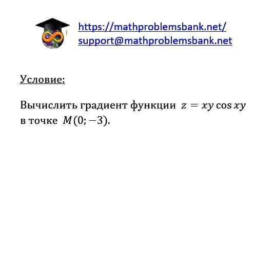 Условие: Вычислить градиент функции \( z=x y \cos x y \) в точке \( M(0 ;-3) \).